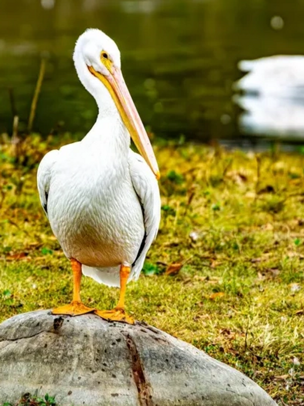 Proud Pelican addresses his Flock. Pond in Ottumwa, Iowa USA