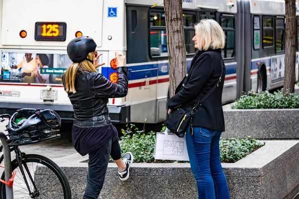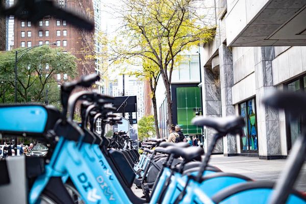 Row of Electric Rental Bicycles Downtown Chicago, USA.